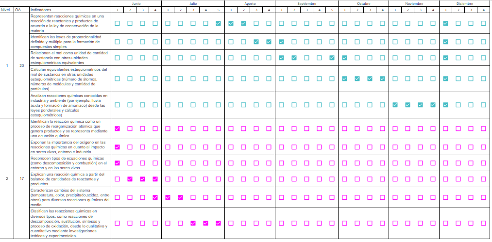 Como se pueden dar cuenta fui haciendo click en los cuadros con las semanas donde trabajaría los objetivos según el indicador de logro que se trabaja, pueden cambiarlo para que en vez de por indicador se trabaje por contenido o por lo que se quiere hacer en la clase. Además, separé por colores lo que corresponde a cada objetivo para que fuera un poco más visual.